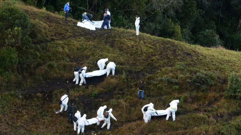 Rescue workers carry the bodies of victims of an airplane that crashed in a mountainous area outside Medellin, Colombia, Tuesday, Nov. 29, 2016 Image copyrightAP