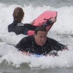 A pre-election year staycation! Cameron with bodyboard on a surfing holiday in Polzeath, Cornwall, in August 2014.