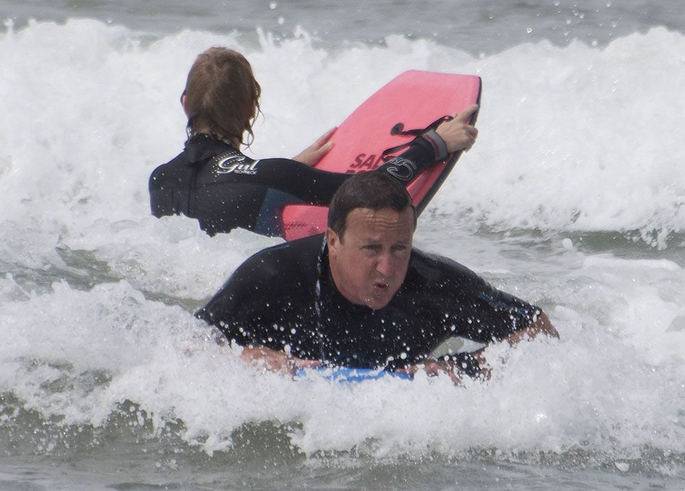 A pre-election year staycation! Cameron with bodyboard on a surfing holiday in Polzeath, Cornwall, in August 2014.