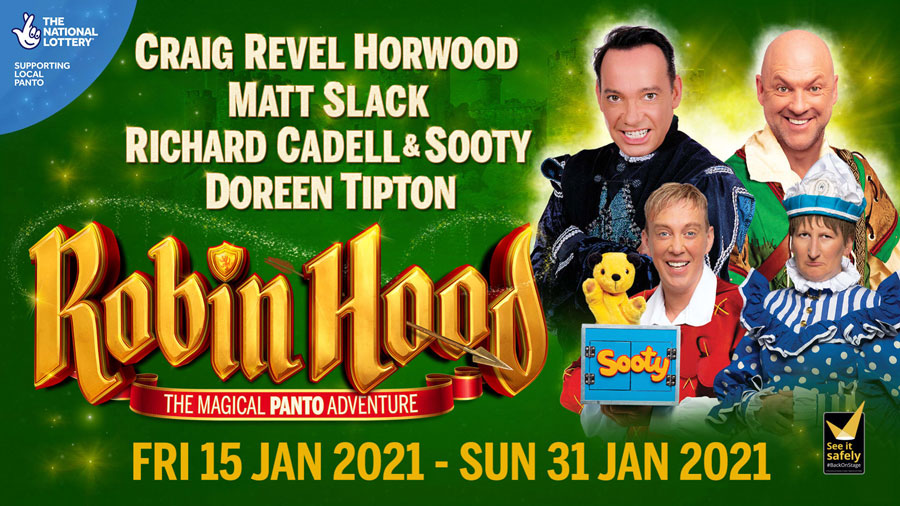 | Birmingham – The Alexandra Theatre – Robin Hood 15 – 31 January 2021 Grab your merry men and women and get ready for a socially distanced pantomime like never before, in a sheriff-busting, arrow-shooting, tights-wearing, hog-roasting production of Robin Hood. We’re grateful for the support of The National Lottery who have helped us ensure panto can return to Birmingham, starring Craig Revel Horwood as the Sheriff of Nottingham, Birmingham’s panto superstar Matt Slack, the legendary pairing of Richard Cadell & Sooty and Black Country favourite Doreen Tipton in this year’s unmissable family production. |