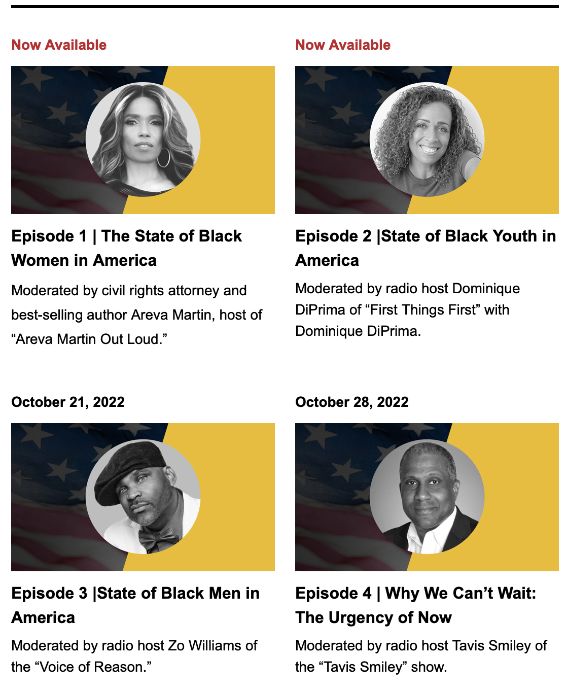 | “Agenda for America: An African American Perspective” A Four Episode Series Executive Produced by Tavis Smiley We at the Black World Media Network are delighted to be collaborating with legendary media personality, Tavis Smiley, and his KBLA team in Los Angeles to bring to our online audience a special series of 2-hour programs each week during the month of October leading up to the midterm elections in early November. The KBLA series will present national conversations on “The State of Black Women in America;” “The State of Black Men in America;” “The State of Black Youth in America;” and finally, “Why We Can’t Wait: The Urgency of Now.” The entire series will also be archived for on-demand access on Black World Media Network. |