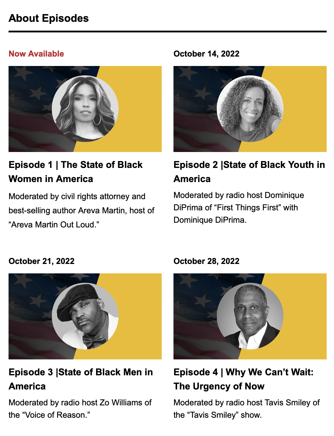 | “Agenda for America: An African American Perspective” A Four Episode Series Executive Produced by Tavis Smiley We at the Black World Media Network are delighted to be collaborating with legendary media personality, Tavis Smiley, and his KBLA team in Los Angeles to bring to our online audience a special series of 2-hour programs each week during the month of October leading up to the midterm elections in early November. The KBLA series will present national conversations on “The State of Black Women in America;” “The State of Black Men in America;” “The State of Black Youth in America;” and finally, “Why We Can’t Wait: The Urgency of Now.” The entire series will also be archived for on-demand access on Black World Media Network. |