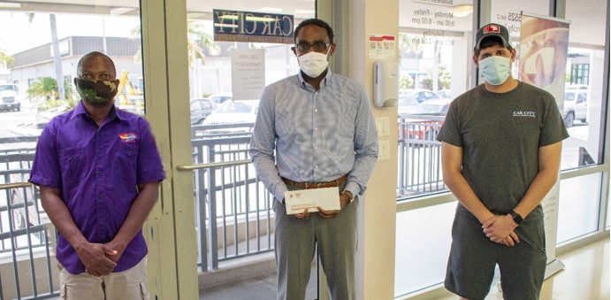 Cleveland Julien from Link International Group is pictured with Taylor Foster and Romeo Thomas from Quality Sewing & Accessories as he received the funds at the Car City Showroom.