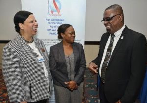 IMAGE: Dereck Springer (right), director of the Pan Caribbean Partnership against HIV and AIDS, shares a moment with Sannia Southerland (centre), programme coordinator at the Caribbean Vulnerable Communities, and Dr Bernadette Theodore-Gandi, PAHO/WHO representative to Jamaica, Bermuda and the Cayman Islands. The occasion was the Regional Meeting on Ending AIDS in the Caribbean, held at The Jamaica Pegasus hotel, New Kingston yesterday. – Ian Allen
