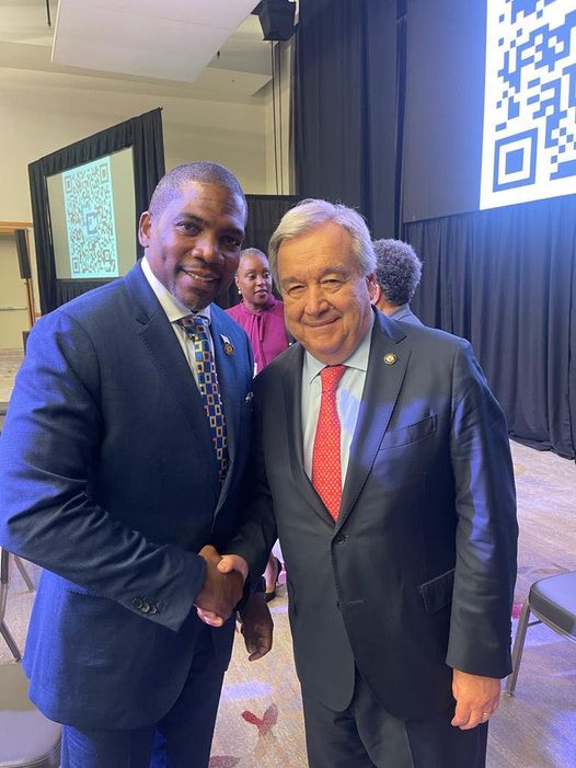 (L-R) Prime Minister of Saint Kitts and Nevis, Hon. Dr. Terrance Drew, and Secretary General of the United Nations H.E. António Guterres at the 45th Regular Meeting of the Conference of Heads of Government of the CARICOM in Port of Spain