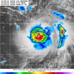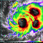 Figure 2. Microwave image of rainfall rates in Hurricane Matthew from the F-16 polar orbiting satellite taken at 5:02 am EDT October 4, 2016. At the time, Matthew was a Category 4 storm with 145 mph winds. Rainfall amounts in excess of 1”/hour (orange colors) were occurring along the coasts of Haiti and the Dominican Republic. Image credit: NRL Tropical Cyclone Page.