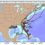 Figure 3. Track forecasts from the four European model ensemble members [gray lines] that most closely match the operational run [red line] during the first 72 hours, starting at 00Z Tuesday, October 4, 2016. The red line is a version of the 00Z Tuesday operational model track that has been adjusted and calibrated using a proprietary technique to account for systemic model errors, and shows Matthew barely missing landfall along the Southeast U.S. coast. All four of the ensemble forecasts showed Matthew making landfall in the U.S., in Florida or South Carolina (though one looked like an improbable outlier, with a looping track off the coast.) The high-probability cluster (grey lines) perform better than other ensemble members at forecast times of five days and beyond. Image credit: Climate Forecast Applications Network (CFAN).