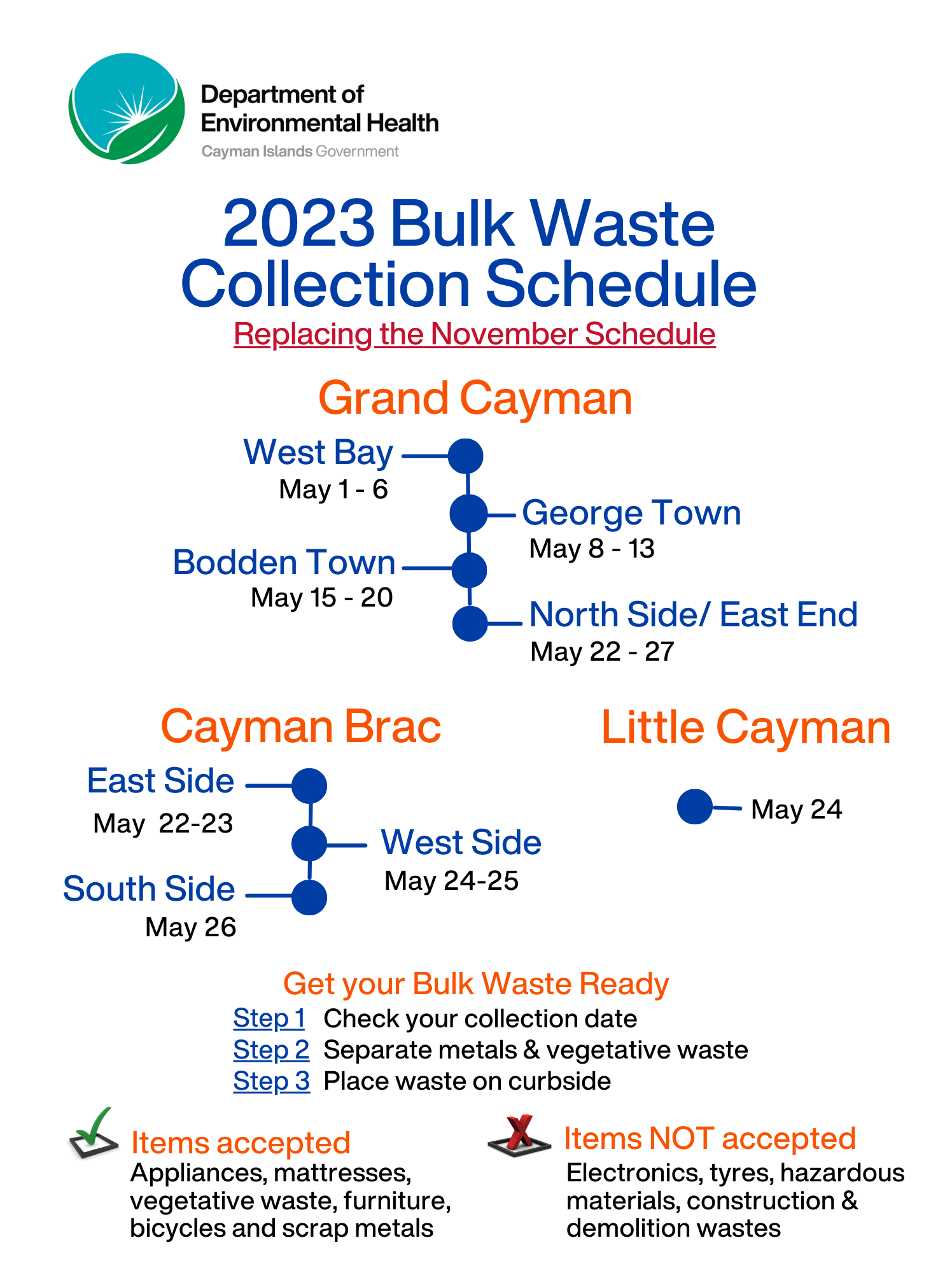 The Department of Environmental Health (DEH) is reminding residents to get their bulk waste ready as the annual collection of bulk waste begins on Monday, May 1, 2023 in the West Bay District. “Over the next four weeks, the DEH…
