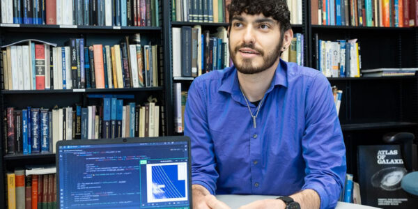 Rodney Levendosky, a senior at New Mexico State University majoring in animation and visual effects, works with Assistant Professor Juie Shetye to apply his skills to astronomy. (NMSU photo by Sarah Kimmerly) At the unexpected intersection of astronomy and animation…