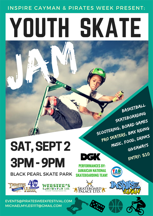 From Michael Myles Chairperson & Manager CI Skateboard Association & Black Pearl Skate Park I am partnering with the Pirates Week Festival to host a Youth Skate Jam on September 2, 3pm-9pm. The event is promoted to raise funding for…