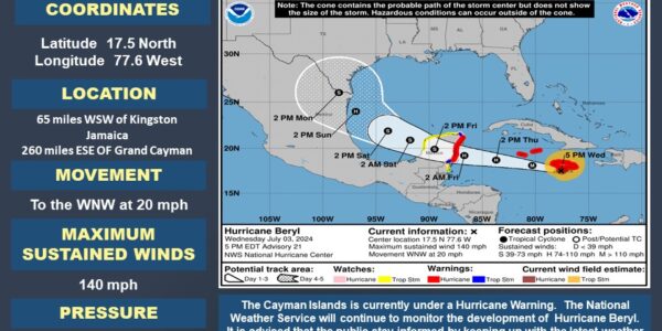 The Cayman Islands National Weather Service continues to monitor Hurricane Beryl, which as of 4:00 p.m. on 3 July was located 260miles East Southeast of Grand Cayman. The public is being reminded that the Cayman Islands remainsunder a Hurricane warning. Residents are encouraged to be vigilant and stay tuned to official channels for weather updates. The…