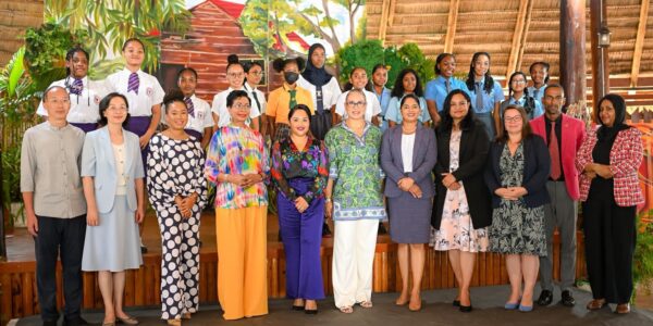 First Ladies Arya Ali of Guyana, Diani Prince-Drew of Saint Kitts and Nevis, Eloise Gonsalves of St. Vincent and the Grenadines, and Ann Marie Davis of The Bahamas, and other attendees at the Menstrual Hygiene Initiative event at the Umana Yana in Kingston, Georgetown, Guyana…