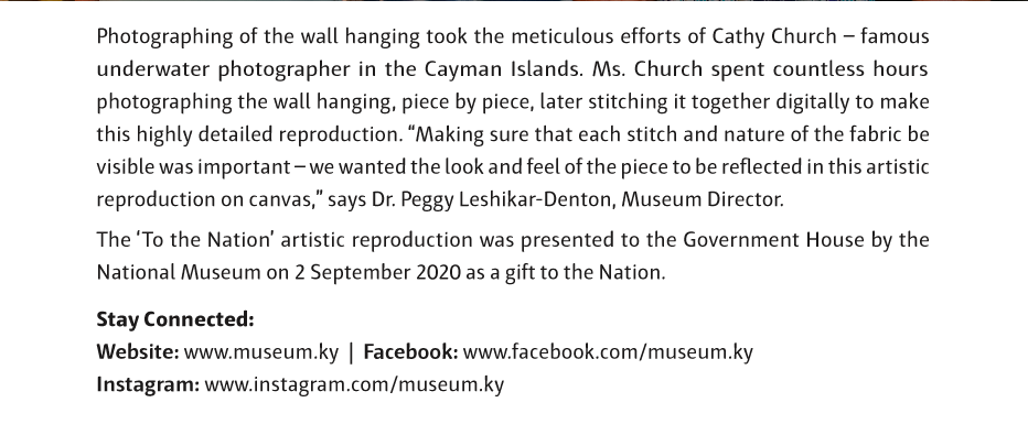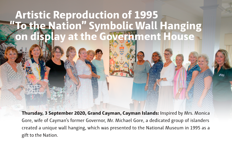 Thursday, 3 September 2020, Grand Cayman, Cayman Islands: Inspired by Mrs. Monica Gore, wife of Cayman’s former Governor, Mr. Michael Gore, a dedicated group of islanders created a unique wall hanging, which was presented to the National Museum in 1995 as a gift to the Nation.