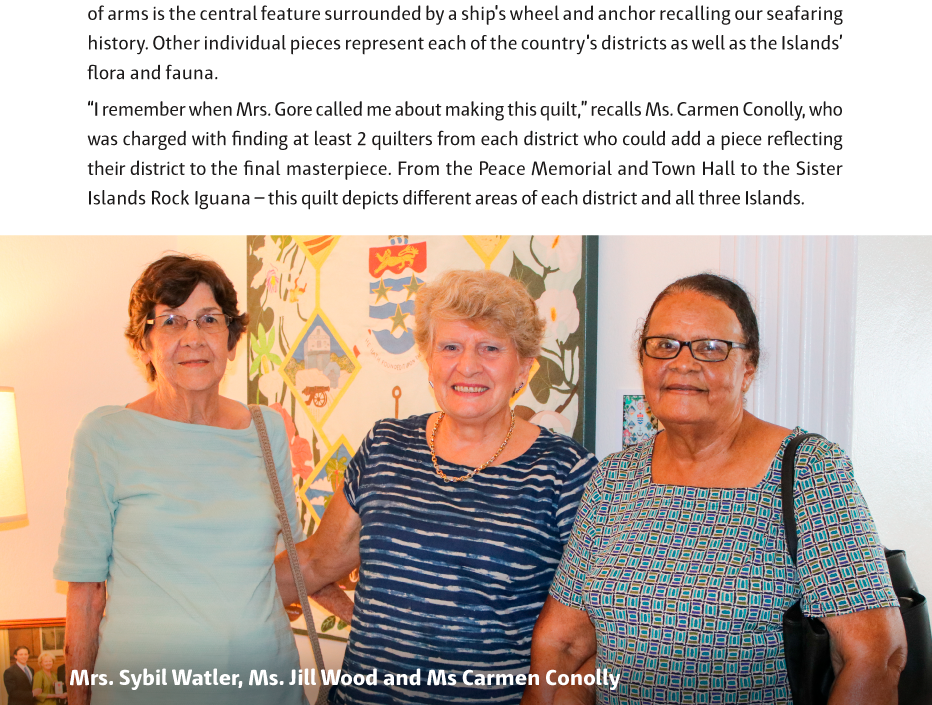 “I remember when Mrs. Gore called me about making this quilt,” recalls Ms. Carmen Conolly, who was charged with finding at least 2 quilters from each district who could add a piece reflecting their district to the final masterpiece. From the Peace Memorial and Town Hall to the Sister Islands Rock Iguana – this quilt depicts different areas of each district and all three Islands.