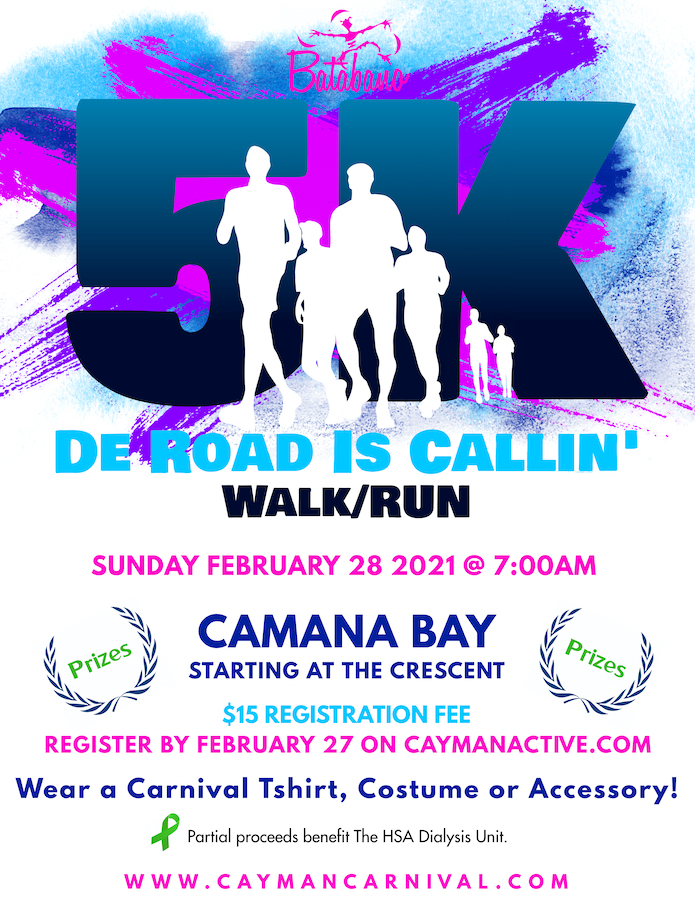 The Cayman Carnival Batabano Committee is holding a 5K Walk/Run on Sunday February 28, 2021. The event starts at 7am at The Crescent in Camana Bay.