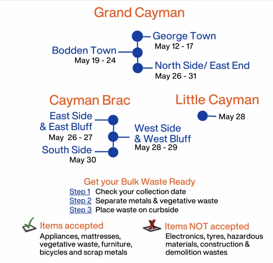 The Department is also reminding West Bay residents that Saturday, May 10, 2025, is the last day for collection in their area. No additional bulk waste must be placed as it will be considered littering or illegal dumping, which can result in a penalty of 6 months of imprisonment and a minimum fine of $500.