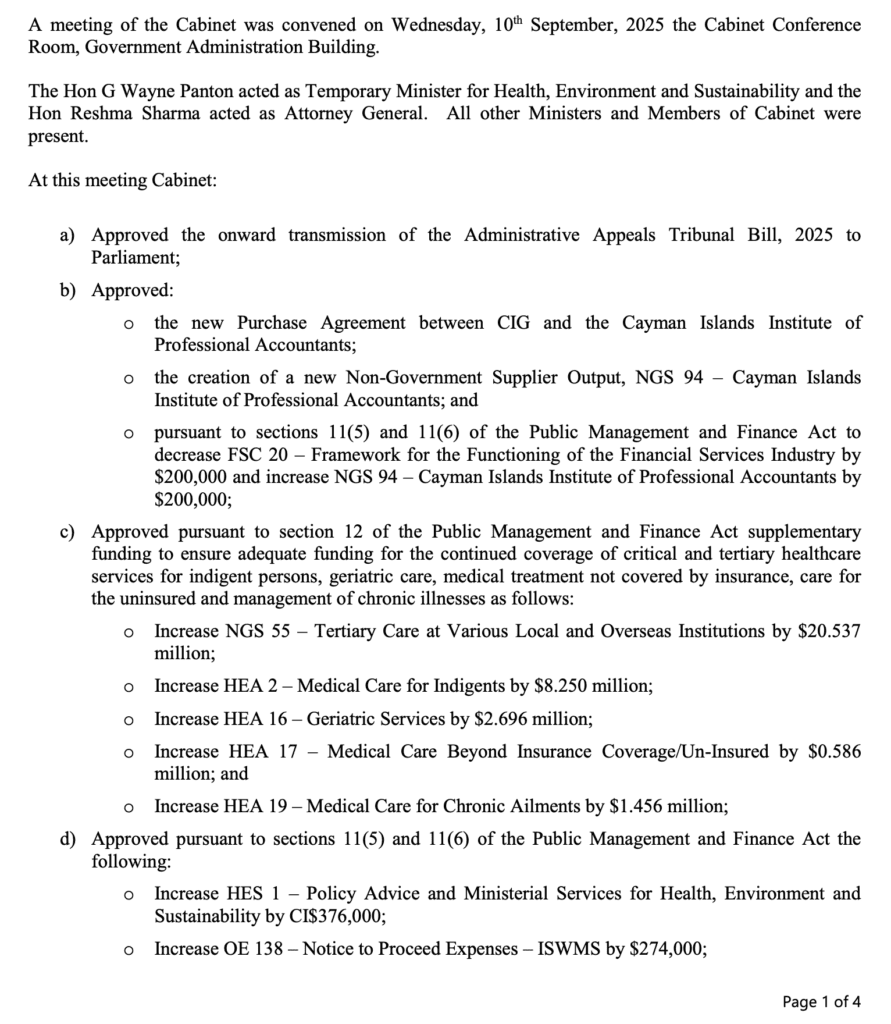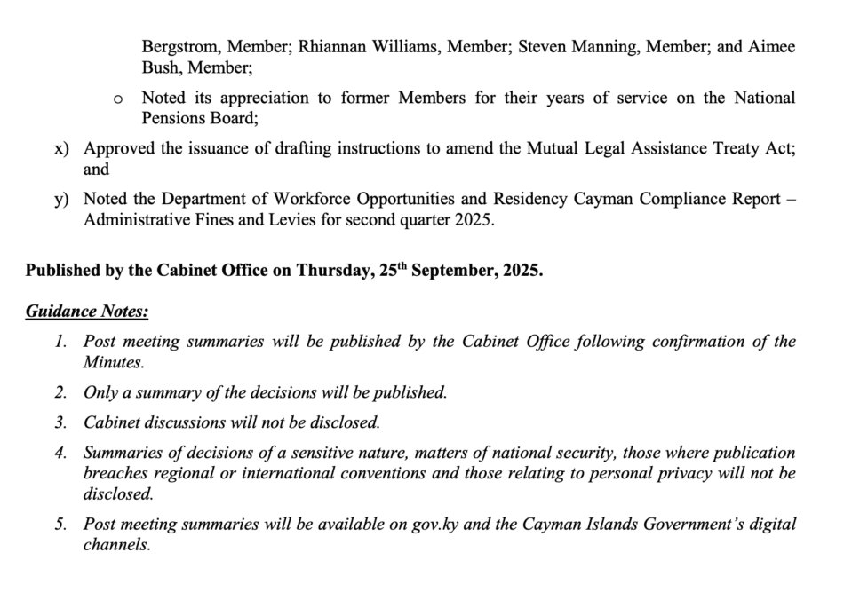 HomepageCaribbean NewsCayman: Cabinet Post Meeting Summary 10 September 2025 Cayman: Cabinet Post Meeting Summary 10 September 2025 Posted on September 25, 2025 CABINET OF THE CAYMAN ISLANDS – POST MEETING SUMMARY LEAVE A RESPONSE Cancel replyYour email address will not be published. Required fields are marked *Comment * Name * Email * Website Post navigation Previous PostTW Wed-Zine Celebrates Inclusivity in 2025 edition themed: “Tides of Love” Next PostCayman: RCIPS Respond to Incident at North Side High School -UPDATE
