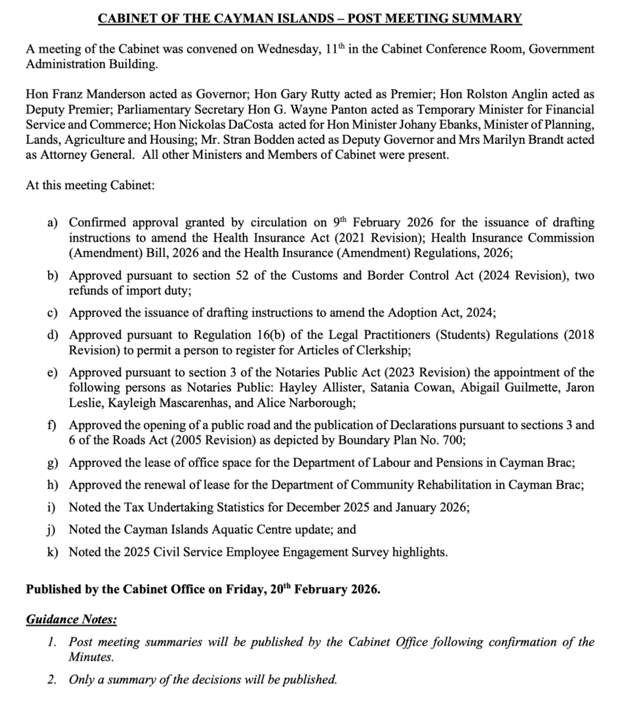 Cayman: Cabinet Post Meeting Summary 11 February 2026