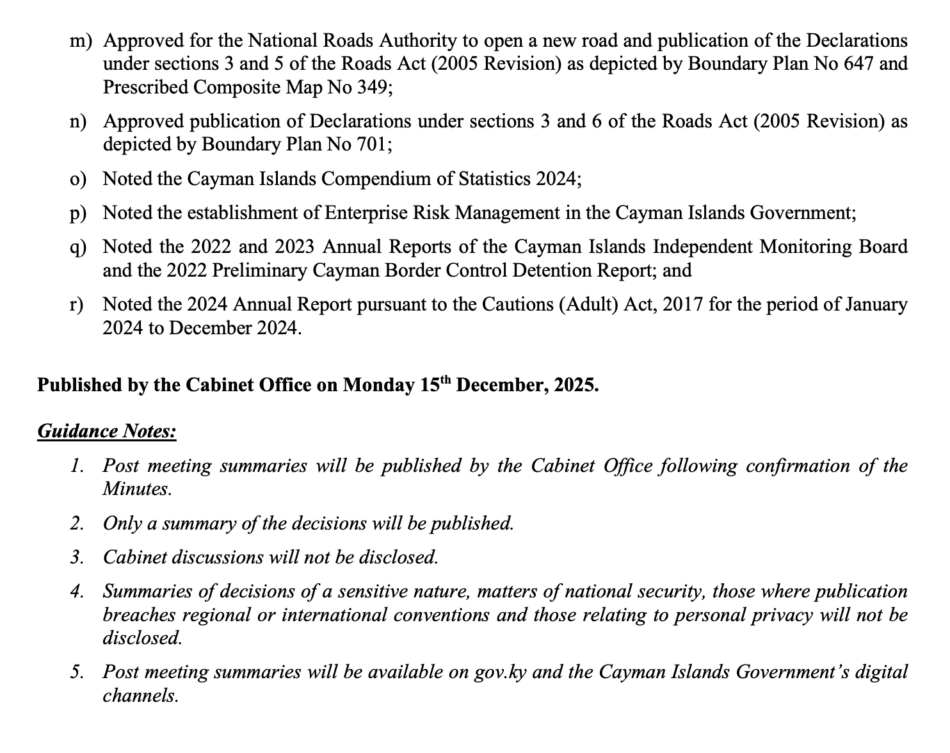 HomepageCaribbean NewsCayman: Cabinet Post Meeting Summary 3 December 2025 Cayman: Cabinet Post Meeting Summary 3 December 2025 Posted on December 15, 2025 Inbox LEAVE A RESPONSE Cancel replyYour email address will not be published. Required fields are marked *Comment * Name * Email * Website Post navigation Previous PostCayman: Summary of Parliamentary Proceedings: 12 December 2025 Next PostEvents and athlete quota for Dolomiti Valtellina 2028 announced