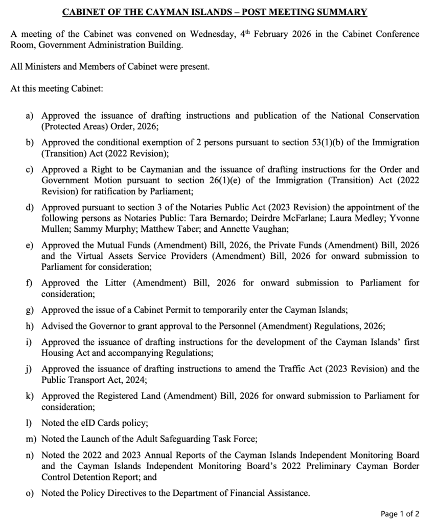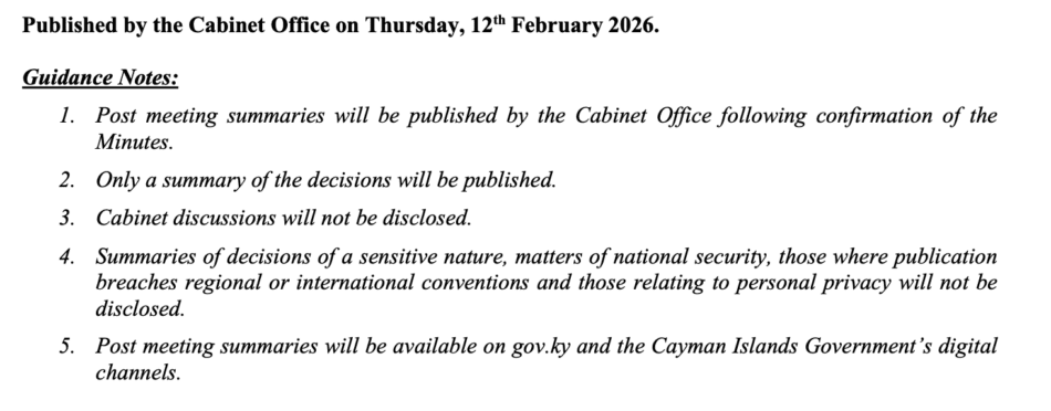 HomepageCaribbean NewsCayman Cabinet Post Meeting Summary 4 February 2026 Cayman Cabinet Post Meeting Summary 4 February 2026 Posted on February 12, 2026 LEAVE A RESPONSE Cancel replyYour email address will not be published. Required fields are marked *Comment * Name * Email * Website Post navigation Previous PostKia K4 takes MotorWeek’s 2026 Drivers’ Choice Award for Best Family Car Next PostAutomechanika Frankfurt features new formats focusing on future trends, networking and the promotion of up−and−coming talent