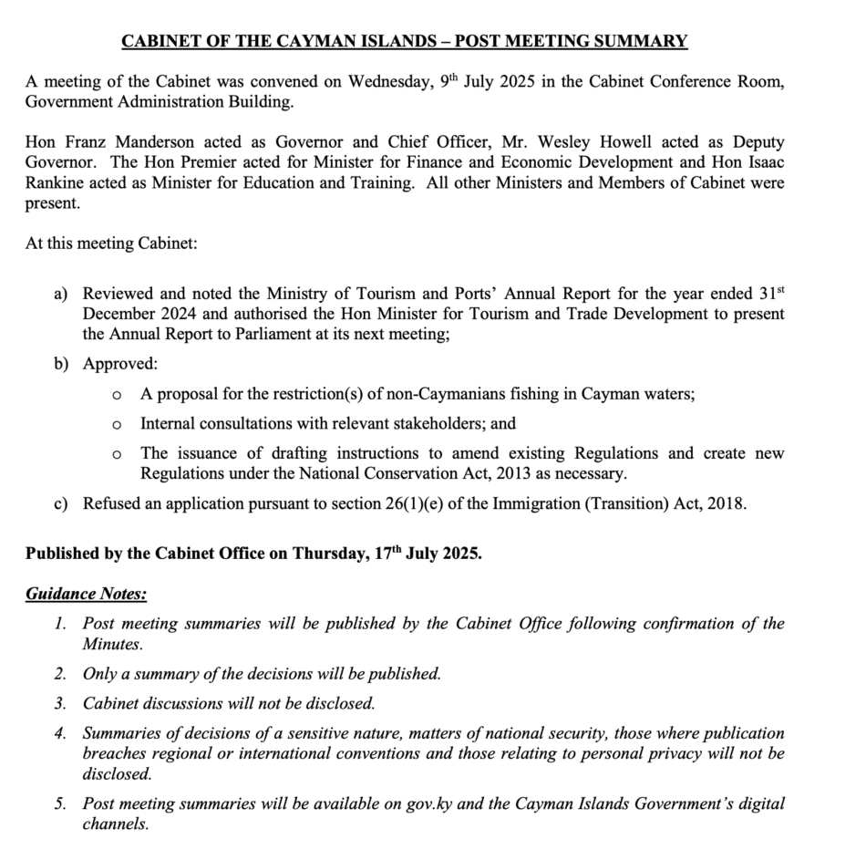 HomepageCaribbean NewsCayman Cabinet Post Meeting Summary 9 July 2025 Cayman Cabinet Post Meeting Summary 9 July 2025 Posted on July 17, 2025 LEAVE A RESPONSE Cancel replyYour email address will not be published. Required fields are marked *Comment * Name * Email * Website Post navigation Previous PostCayman: IP Register Enhances Search Capabilities Next PostCayman: Two Men Arrested following Joint CICG and RCIPS Operation in East End