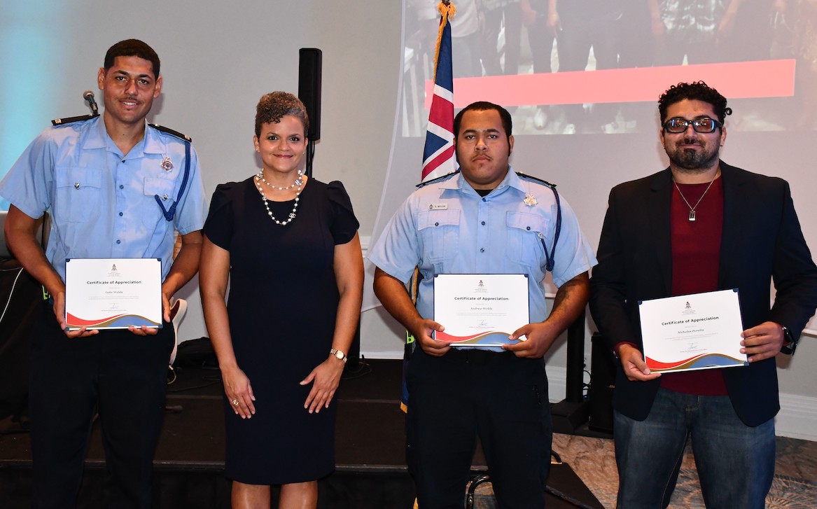 Firefighters Luke Welds, Daniel Bernard, Jeffrey Ebanks, Christopher Webb, Tony Chisholm as well as Pump Engineers Nicholas Peralta, Andrew Welds, Vincent McElroy and Fire Safety Inspector Darnley Scott received the Partnership Working Certificate for their successful close working with colleagues from the Health Services Authority, Coast Guard and Department for Public Safety Communications.