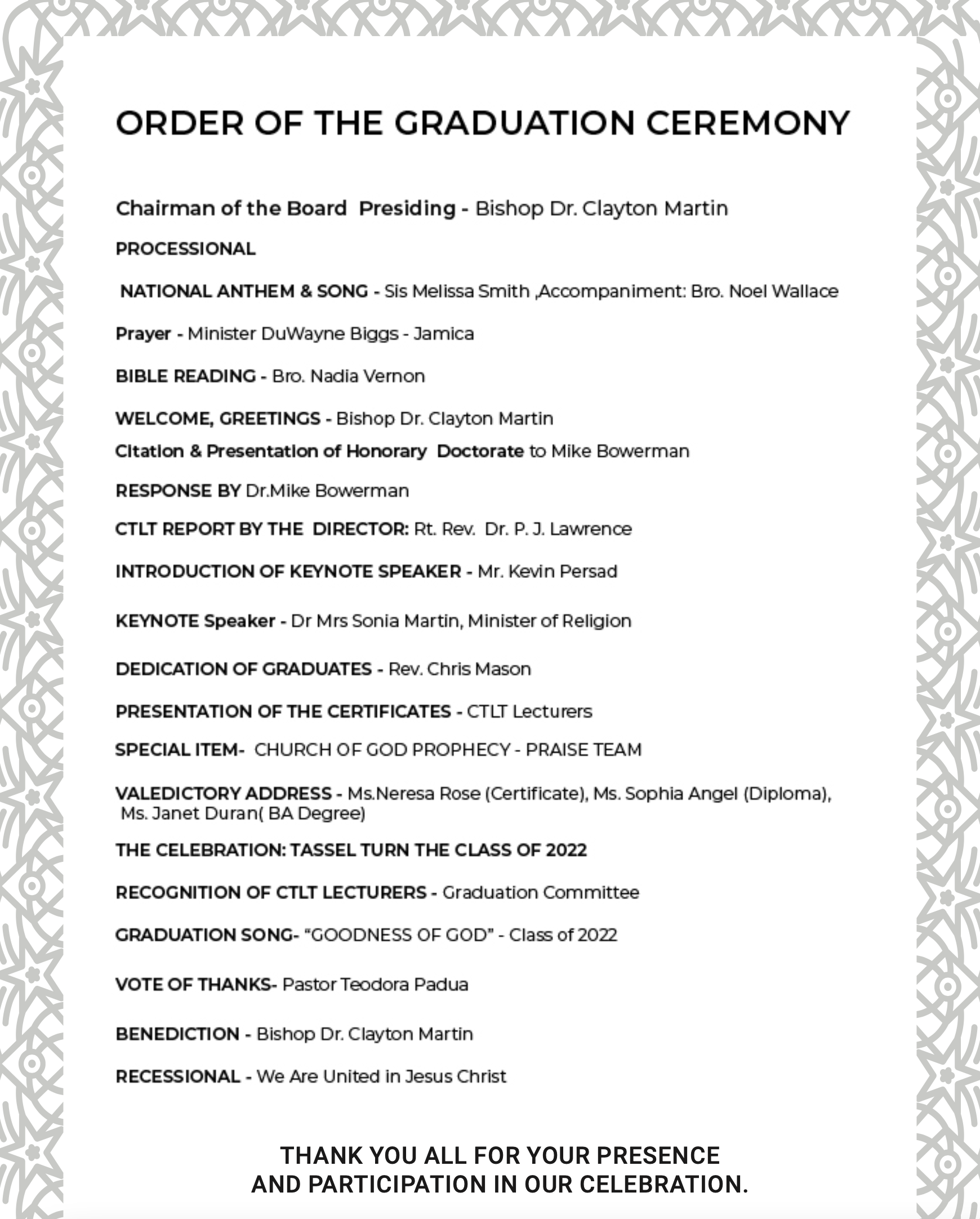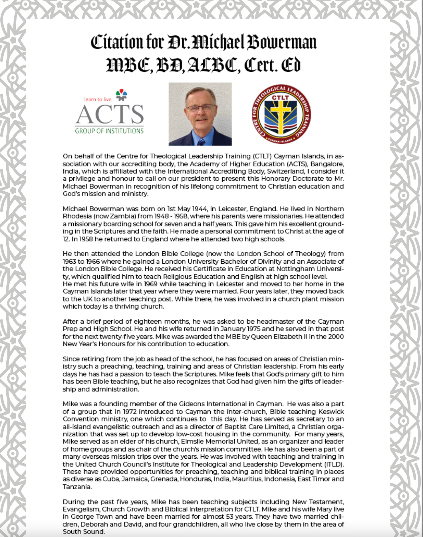 HomepageEditors ChoiceCayman: Citation for Dr. Michael Bowerman and new programme offered for Certificate in Theological Leadership Sept 2022-June 2023 Cayman: Citation for Dr. Michael Bowerman and new programme offered for Certificate in Theological Leadership Sept 2022-June 2023 Posted on June 26, 2022 from Rt. Rev. Dr. Bishop PJ Lawrence LEAVE A RESPONSE Cancel replyYour email address will not be published. Required fields are marked *Comment * Name * Email * Website Post navigation Previous PostCayman: Police investigate serious collision in Savannah Next PostCayman Islanders go to Songea, Tanzania on a Mission Trip
