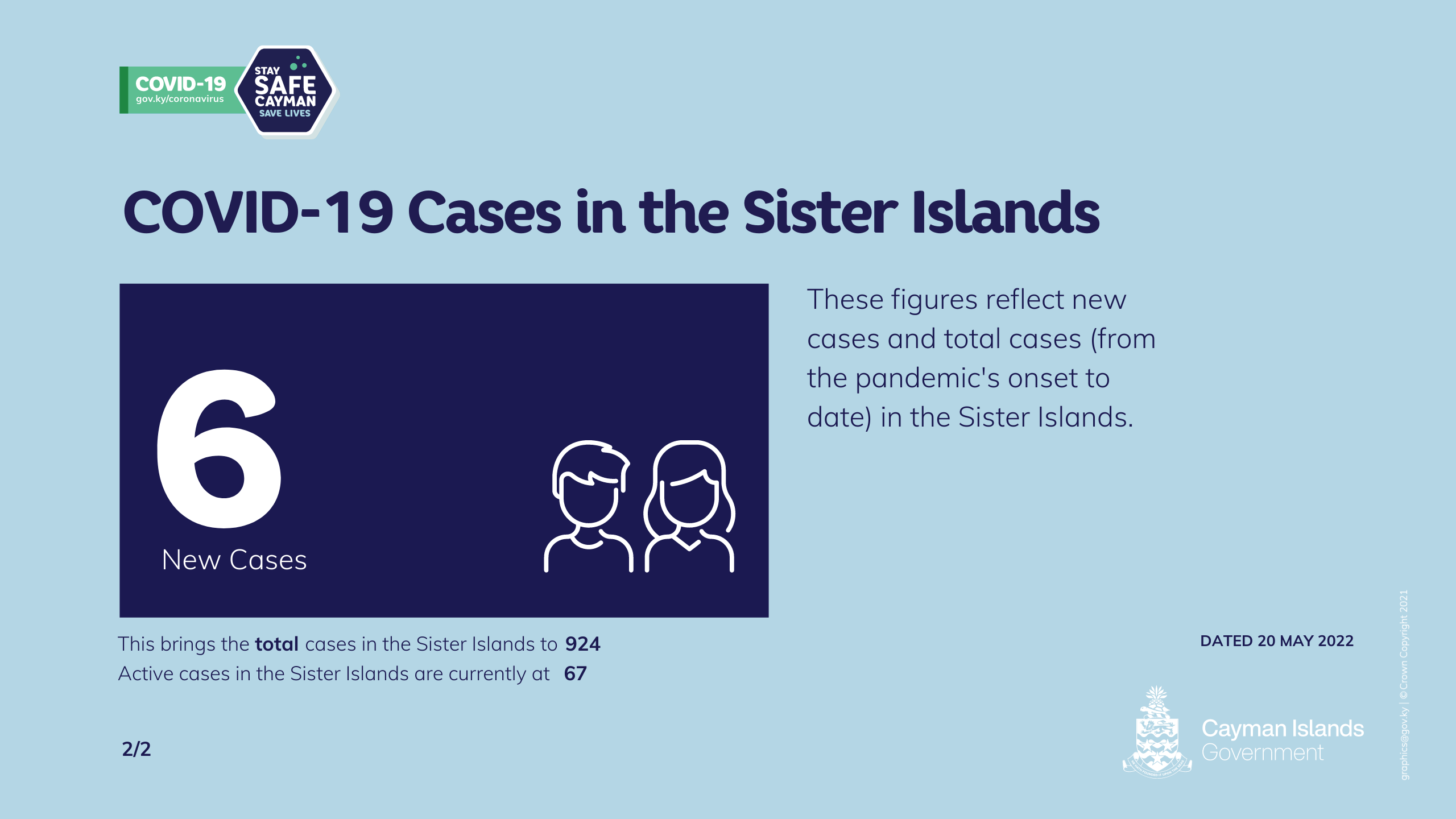 The Sister Islands reported 6 new cases, leaving total cases since the beginning of the pandemic at 924. Active cases in the Sister Islands are currently at 67.