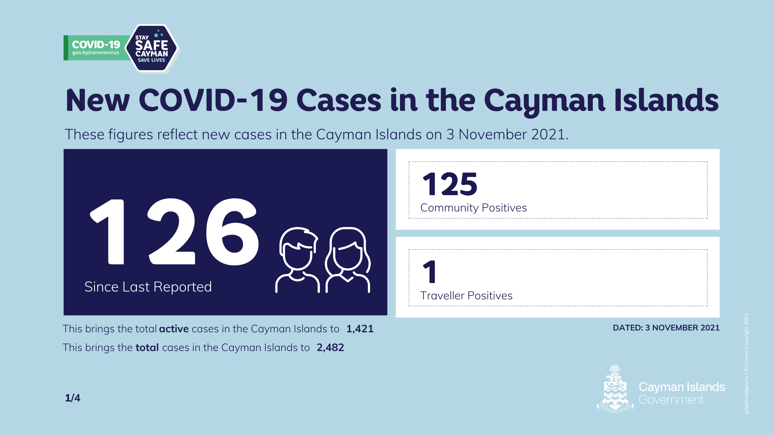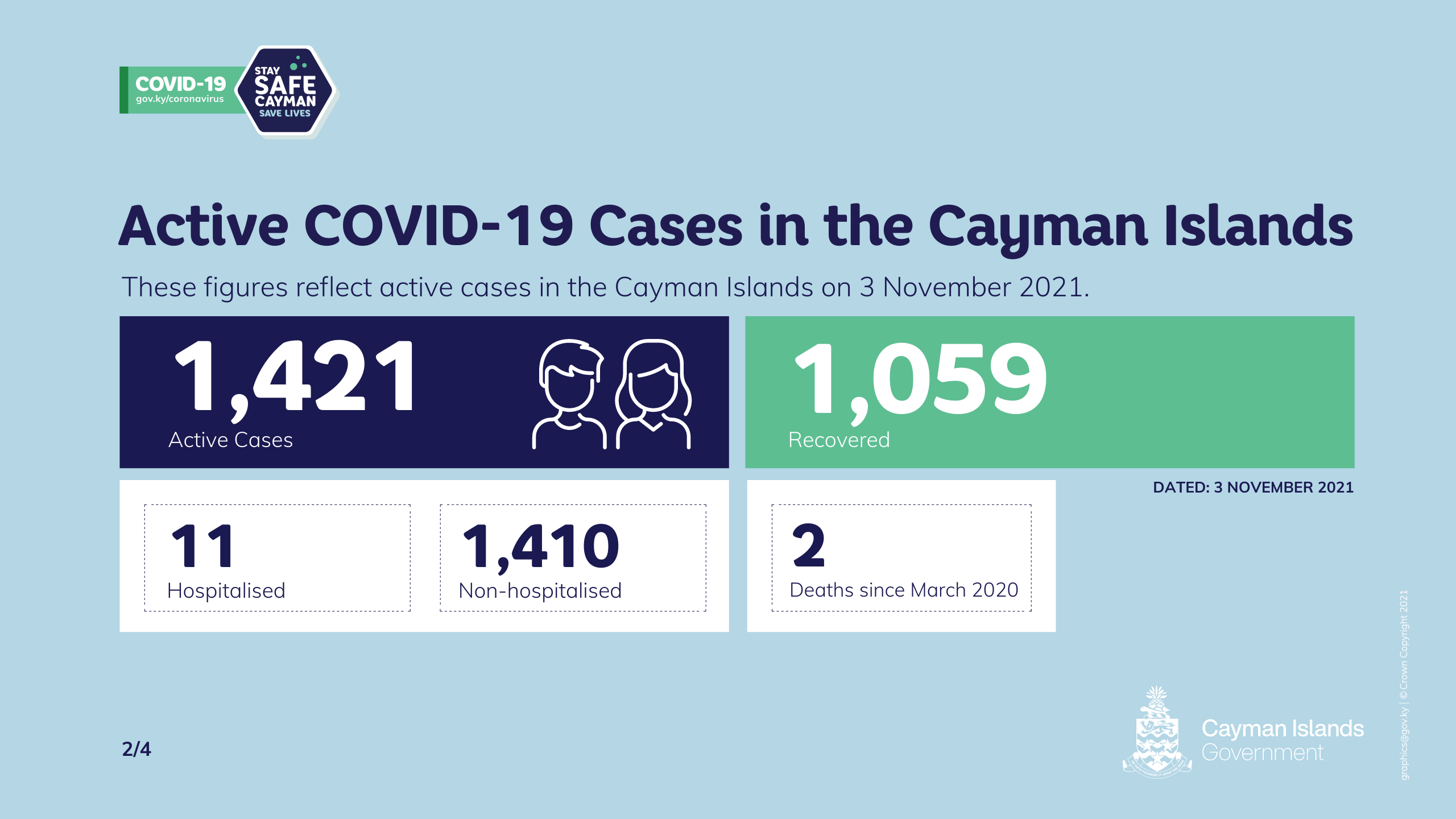 These results bring the number of active cases of COVID-19 in the Cayman Islands to 1,421 as of 8 a.m. Wednesday, 3 November.