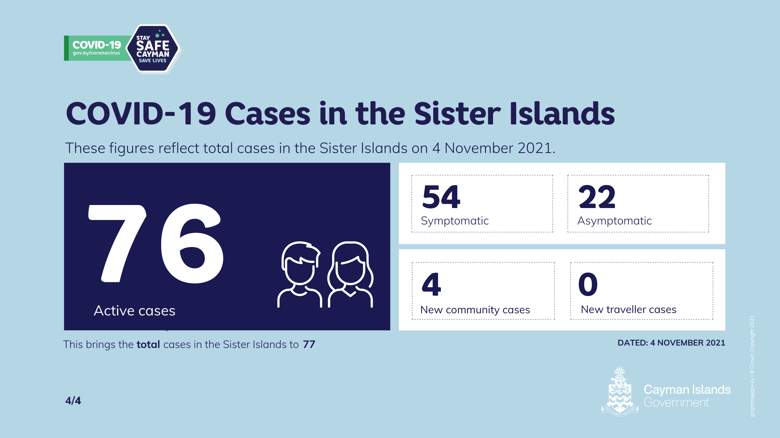 As of 8 a.m. Thursday, 4 November there are 76 active cases in the Sister Islands, with four of these cases identified in the previous 24 hours. All of the new cases were from the community.