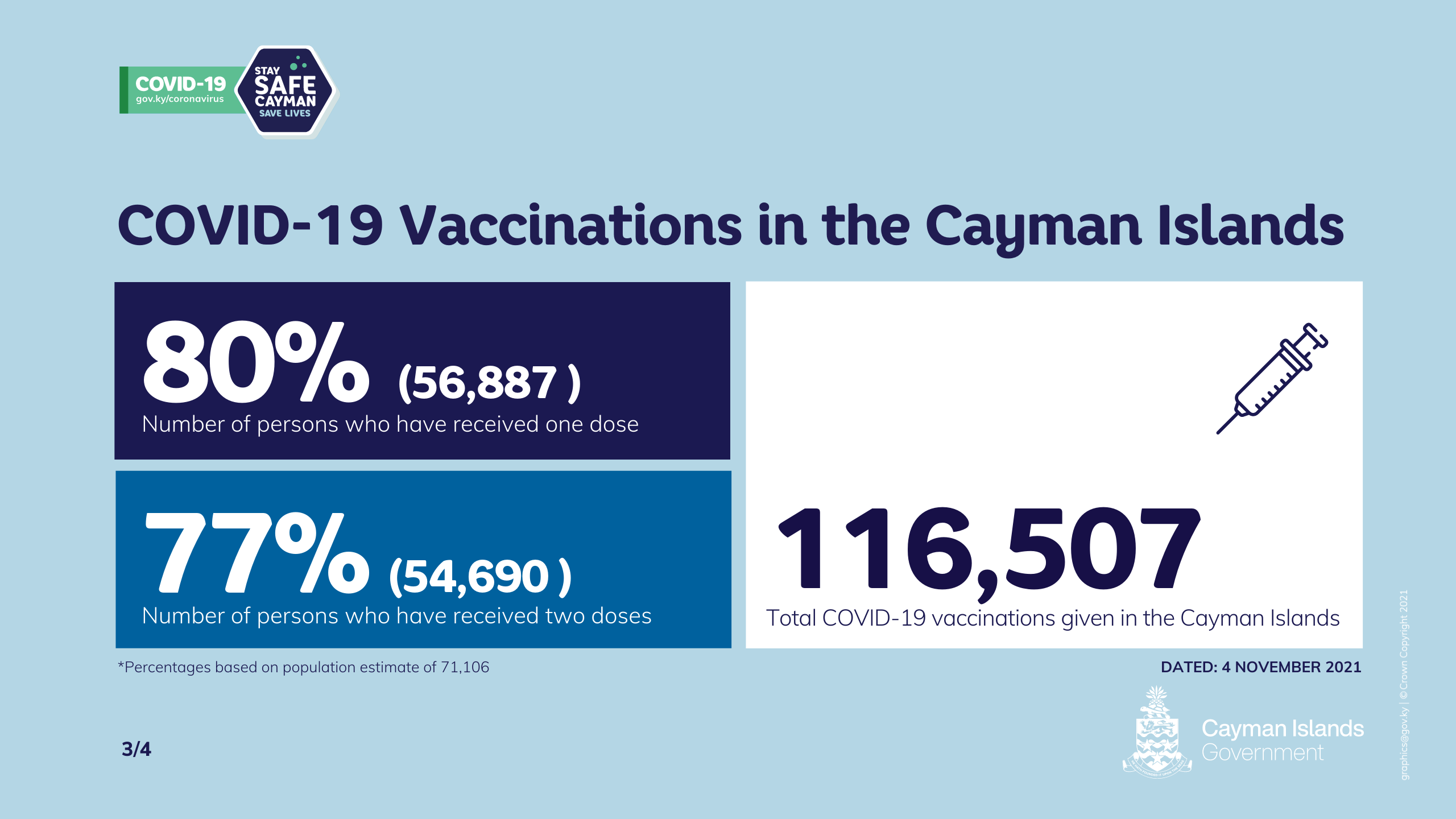As of 8 a.m. on Thursday, 4 November there had been 116,507 COVID-19 vaccinations given in total in the Cayman Islands. Of these, 56,887 (80% of 71,106) have had at least one dose of a COVID-19 vaccine and 54,690 (77%) have completed the two-dose course.
