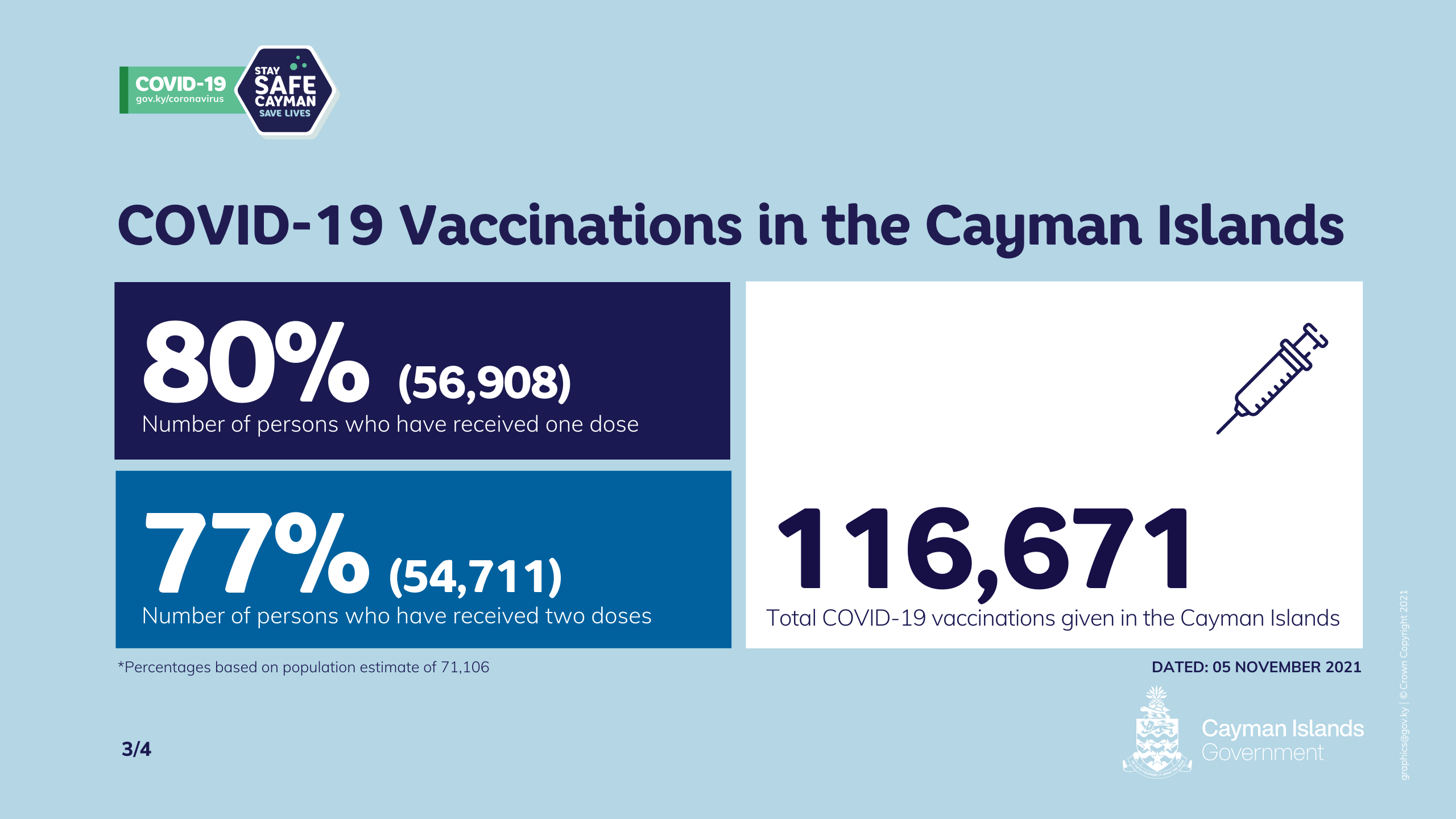 There have also been 116,671 COVID-19 vaccinations given in total in the Cayman Islands. Of these, 56,908 (80% of 71,106) have had at least one dose of a COVID-19 vaccine and 54,711 (77%) have completed the two-dose course.