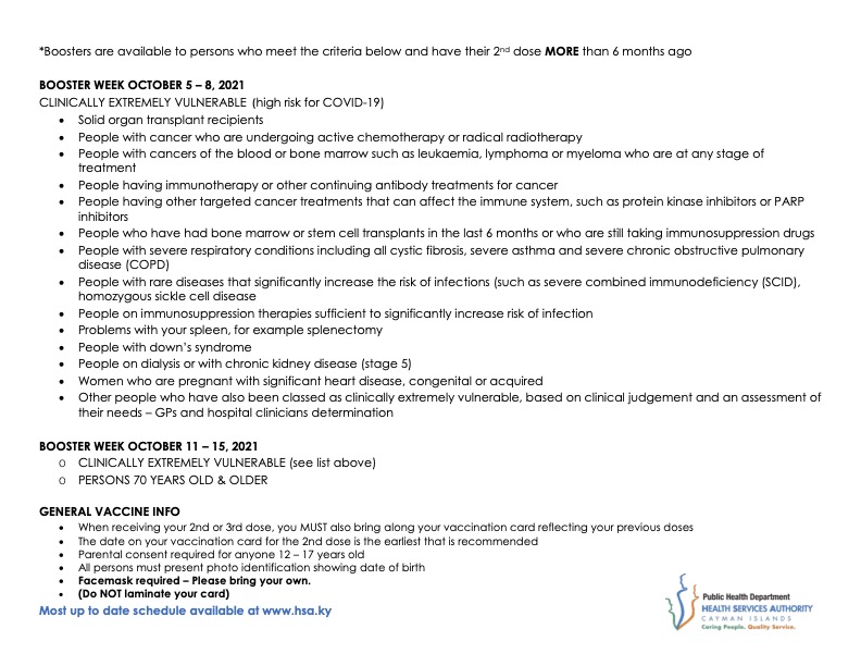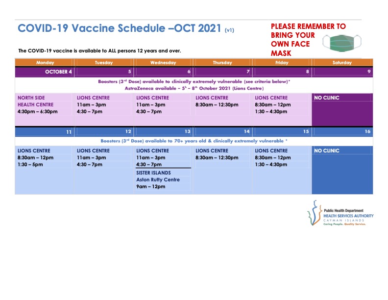 Cayman: COVID-19 Vaccine Schedule –OCT 2021