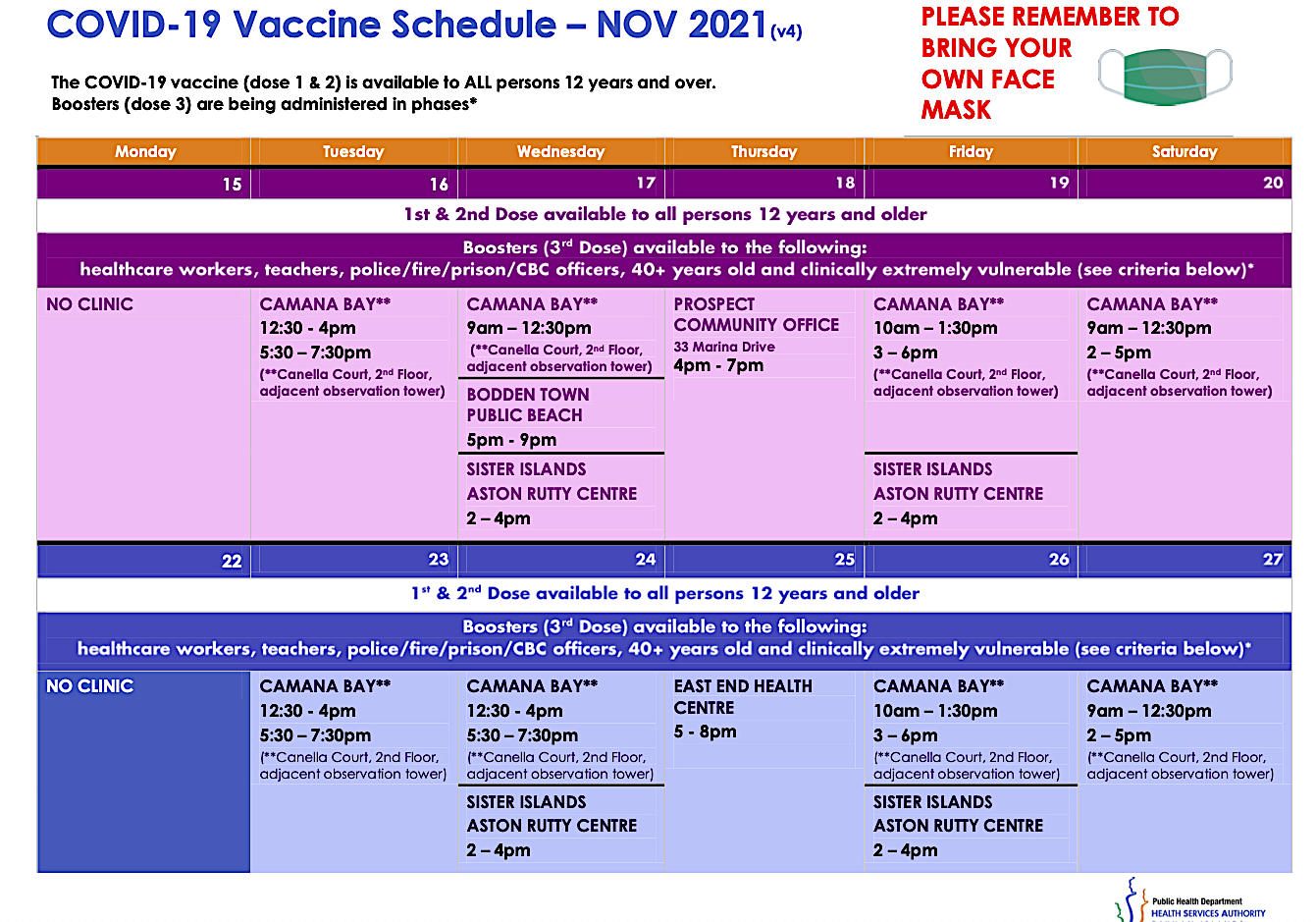 HomepageCaribbean NewsCayman: COVID Vaccine Schedule Nov15-27 Cayman: COVID Vaccine Schedule Nov15-27 Posted on November 22, 2021 LEAVE A RESPONSE Cancel replyYour email address will not be published. Required fields are marked *Comment * Name * Email * Website Post navigation Previous PostCayman: All Post Offices Closed Saturday, 27 November Next PostCAP Celebrates 75 Years of Pathology with the Publication of a New Book