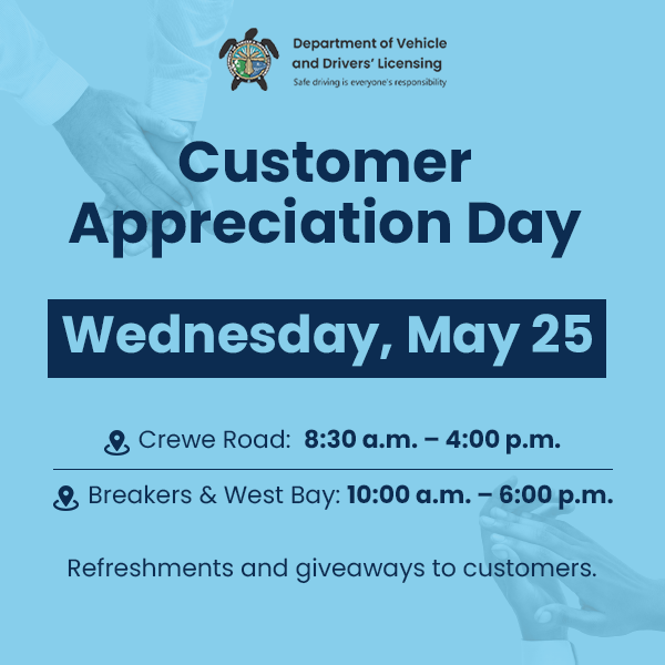 Grand Cayman – The Department of Vehicle and Drivers’ Licensing (DVDL) will host a Customer Appreciation Day at its three locations on Wednesday, May 25.