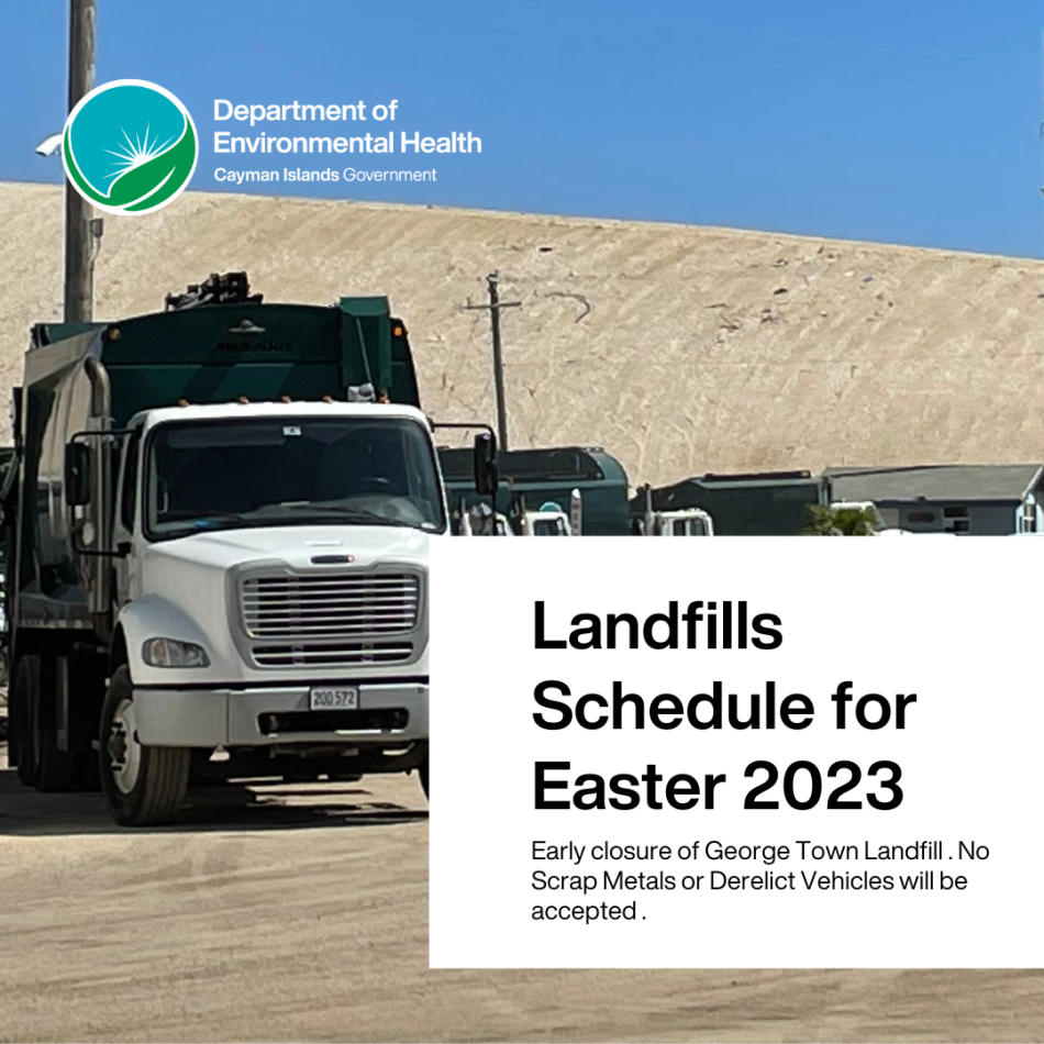 All landfills will reopen on Saturday, April 8, 2023. Operations in the George Town landfill will close at 1:00 pm on this day and on Easter Monday, April 10, 2023. The 24-hour drop off site at the entrance of the George Town Landfill will, however, remain open to facilitate the disposal of small quantities of household waste. Meanwhile, the Cayman Brac and Little Cayman landfill will close at 5:00 pm as normal.
