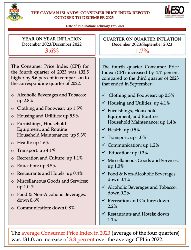 More information from the Cayman Islands Consumer Price Index Report: October to December 2023 may be downloaded from www.eso.ky