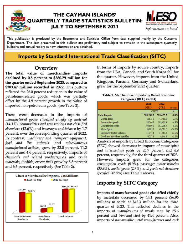 More information on the “The Cayman Islands’ Quarterly Trade Statistics Bulletin: July to September 2023,” is available at www.eso.ky