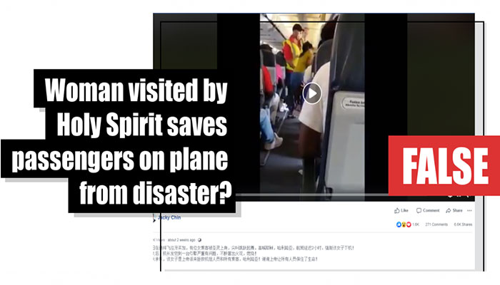 A video has been viewed hundreds of thousands of times in multiple Facebook posts which claim that it shows a woman who was visited by the Holy Spirit on a plane and subsequently saved the passengers from a fire which broke out on board. The claim is false; the video shows two videos of unrelated incidents — a woman who became distressed on a Cayman Airways plane and an American Airlines plane which failed to take off in Chicago after a fire broke out on board.
