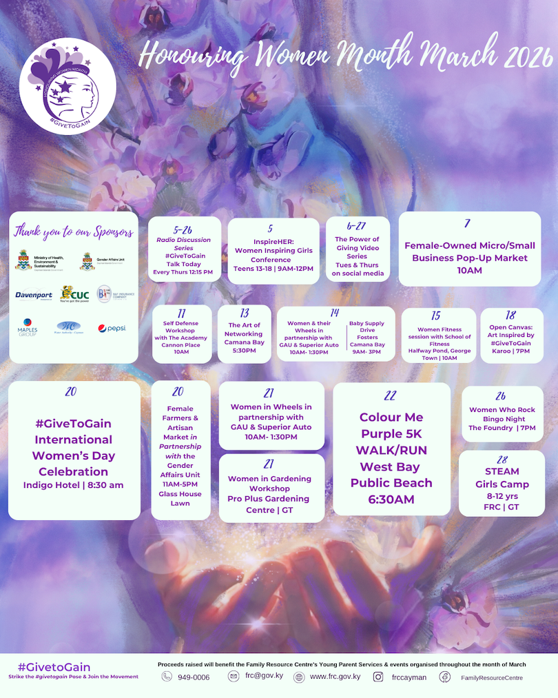 “Honouring Women Month is a powerful reminder that gender equity requires both recognition and responsibility,” said Hon. Katherine Ebanks-Wilks, Minister for Health, Environment and Sustainability. “When we celebrate women’s contributions and actively address the barriers they face, we strengthen our nation and our future. I commend the Family Resource Centre for its continued leadership and dedication to fostering empowerment and wellbeing for women and families across the Cayman Islands, and I encourage everyone, whether Caymanian or visitor, resident or friend, to embrace the spirit of Give to Gain in March. Support the Family Resource Centre by contributing your time, knowledge, skills, or resources to initiatives that empower women and young parents.”