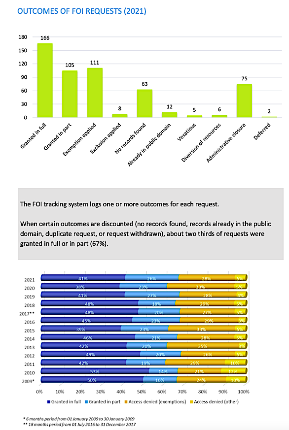 This report provides statistics on compliance with the Freedom of Information Act (2021 Revision) in the Cayman Islands Public Sector. It places the 2021 FOI outcomes and activities in the context of the trends and results since 2009, when the FOI Act came into effect.