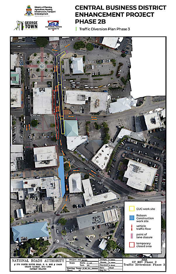 George Town, Grand Cayman, 6 March 2024: The Ministry of Planning, Agriculture, Housing, Infrastructure, Transport & Development’s (“PAHITD”) Central Business District Enhancement Project (“CBDEP”) Phase Two continues to progress, as works move in to the third phase of the National Roads Authority’s (“NRA”) Traffic Diversion Plan.