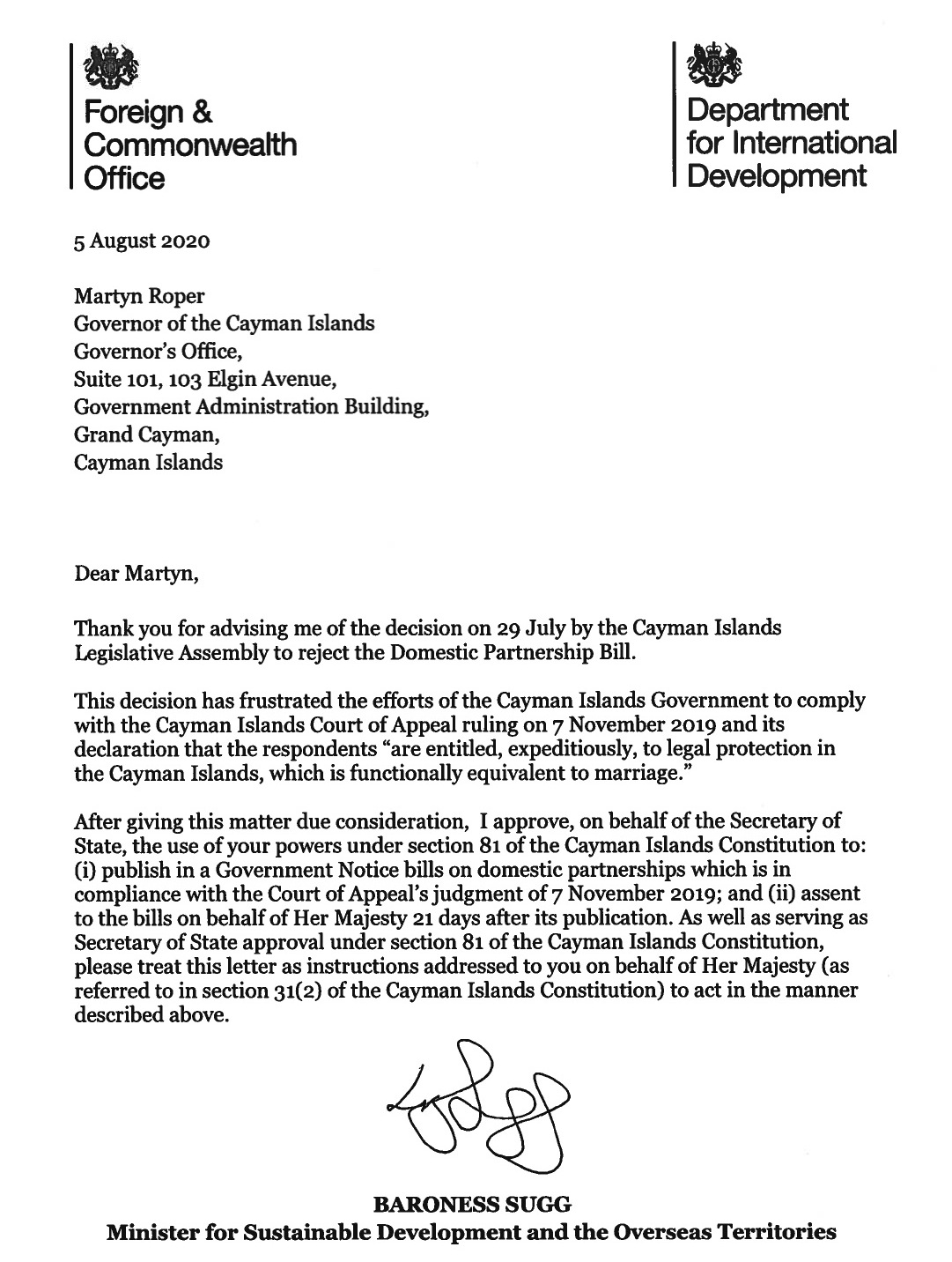 “In its ruling of 7 November 2019 the Cayman Islands Court of Appeal was clear that, by its continuing failure to put in place a legal framework for same sex couples, functionally equivalent to marriage, the Cayman Islands was in breach of the Bill of Rights in the Constitution and the European Convention on Human Rights (ECHR). The Court also made it clear that, should the Cayman Islands Legislature fail to act to rectify the situation, the UK should recognise its responsibility for ensuring that the Cayman Islands complies with its responsibilities under the Constitution and its international obligations. Ensuring compliance with international obligations falls squarely within my responsibilities under section 55(1) (b) of the Constitution. Given that responsibility I was instructed, on 5 August, by the Minster for Sustainable Development and the Overseas Territories, Baroness Sugg, who is acting on behalf of the UK Secretary of State, to utilise Section 81 of the Cayman Islands Constitution to rectify this situation. I have today received permission to release that letter.