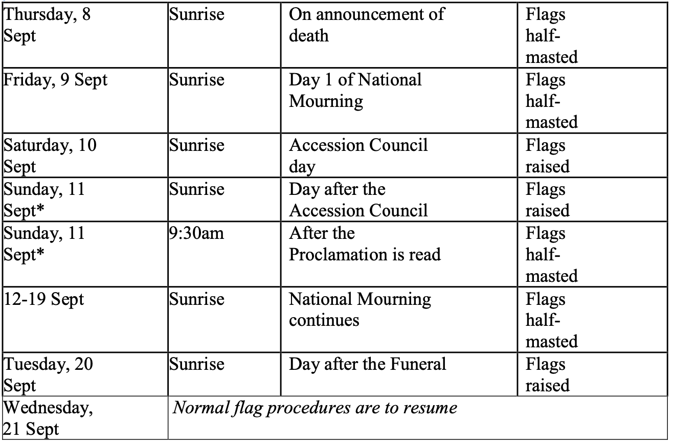 Cayman Island Government Flag Protocols for National Mourning Period 8-20 September 2022