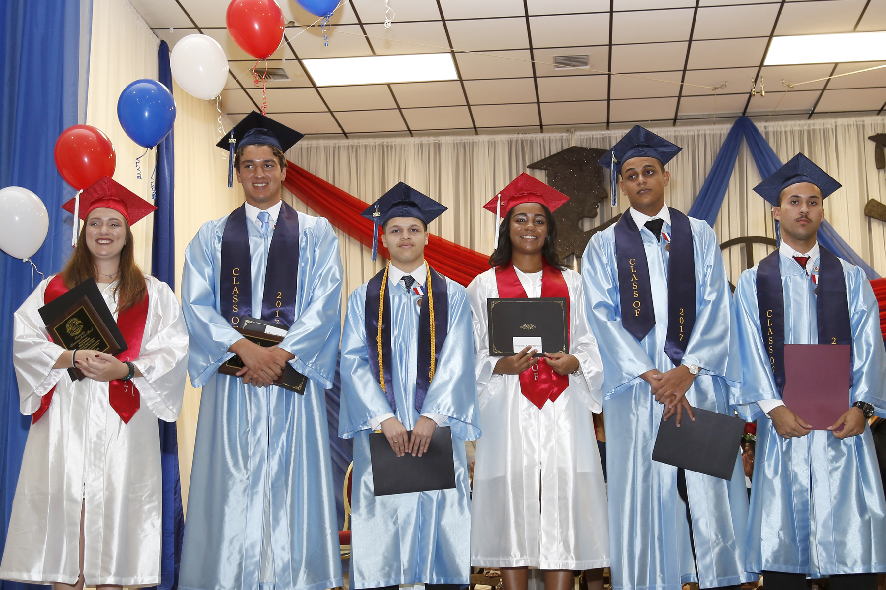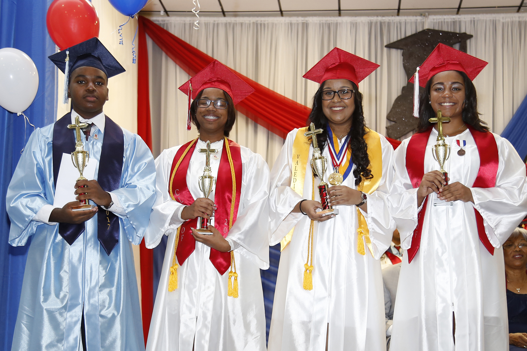 Picture 1: Class of 2017 Picture 2: Jacie Mascarenhas, Valedictorian and Frank Noguera Villarroel, Salutatorian. Picture 3: The four Creative Christian Character awards recipients: David Brown, Jada Connor, Jacie Mascarenhas and Patricia Thompson Picture 4: Grace Ruby receiving the High School Visual Arts Achievement Award presented Mrs. Tanya Whiteside from the National Gallery Picture 5: Commencement speaker, Suahil Housholder (Scott), Class of 1993 Picture 6: The five Save Our Youth awards recipients: Grace Ruby, Jonathan Key, Isaiah Ebanks, Patrisia Thompson, Zion Coe, and Nike Rivers.