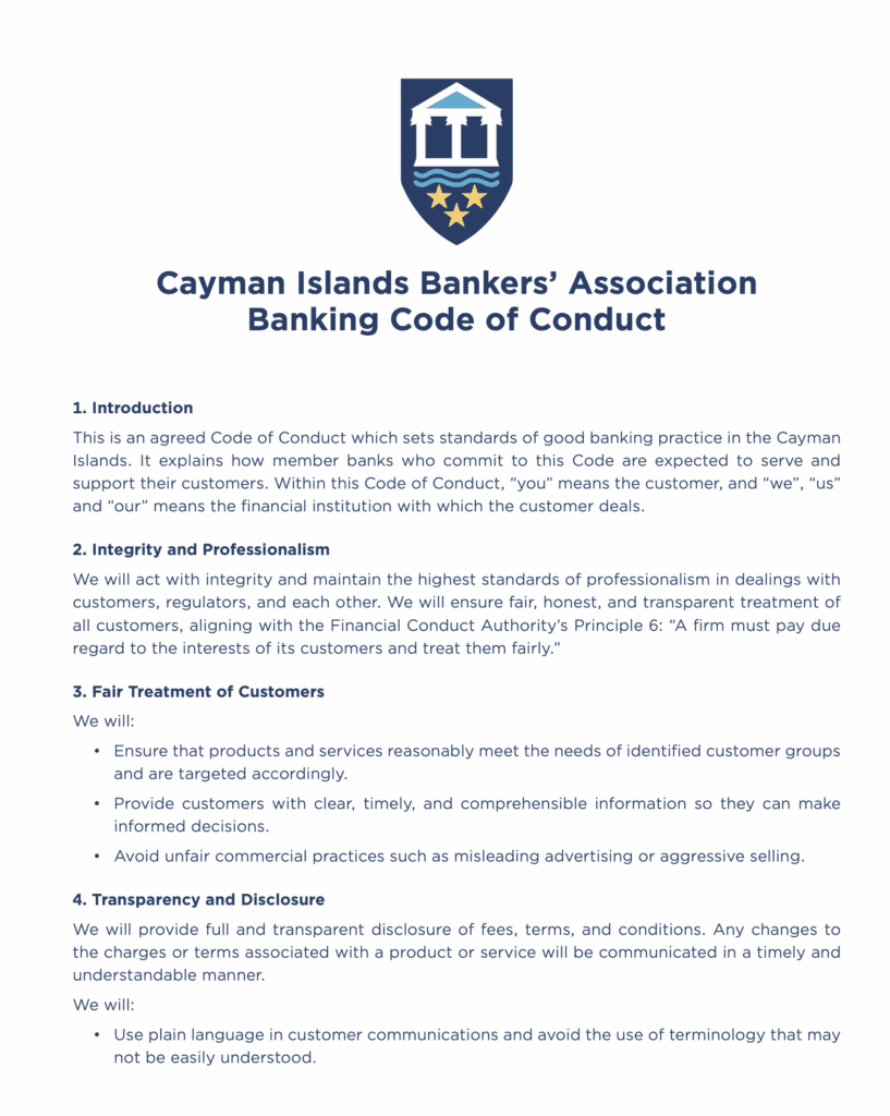 The Cayman Islands Bankers’ Association (CIBA) today announced that its member retail banks have adopted a revised Code of Conduct, reflecting a renewed commitment to delivering good outcomes for customers and considering their best interests at all times.