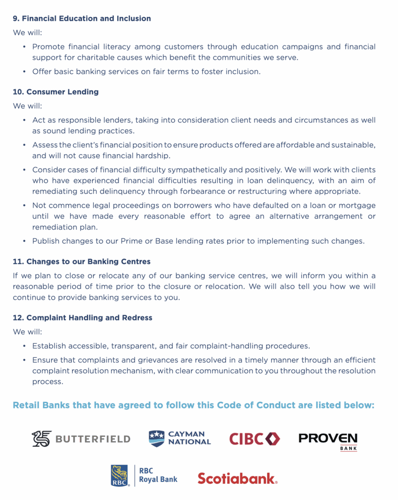 Member banks that have subscribed to the revised Code of Conduct are Butterfield Bank (Cayman) Ltd., Cayman National Bank Ltd., CIBC Caribbean, PROVEN Bank, RBC Royal Bank (Cayman) Limited, and Scotiabank & Trust (Cayman) Ltd.