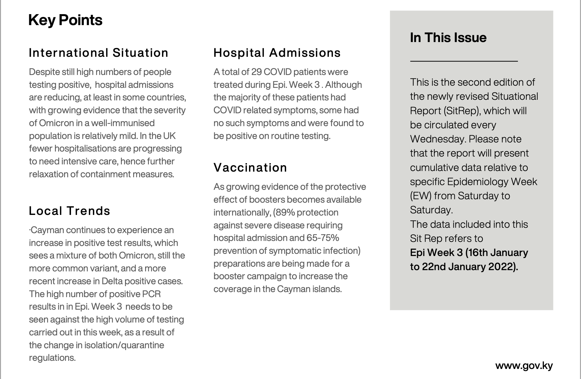 HomepageCaribbean NewsCayman Islands COVID-19 Situational Report (SitRep) Cayman Islands COVID-19 Situational Report (SitRep) Posted on January 26, 2022 LEAVE A RESPONSE Cancel replyYour email address will not be published. Required fields are marked *Comment * Name * Email * Website Post navigation Previous PostCayman: Second Weekly COVID-19 Situation Report (16-22 January 2022 – 2,739 NEW Positives) Next PostCayman: Covid-19 Vaccine Schedule – Jan/Feb 2022