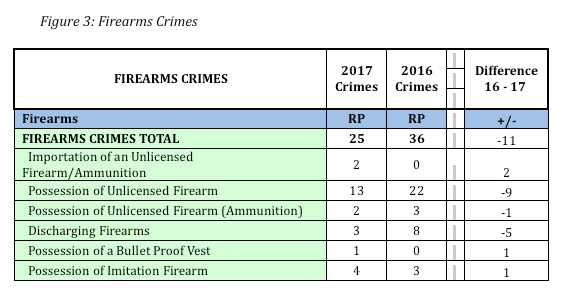 In 2017, there were 25 confirmed firearm crimes, which was a decrease of 31% (11) compared to 2016. Firearm crimes in 2017 accounted for only 0.6% of all crimes recorded.