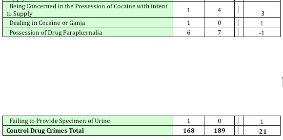 Overall, there was an 11% (21) decrease in drug crimes in comparison with 2016. It is important to note that decreases in discrete drug offences can happen even while the overall amount of drug seizures and drug enforcement increases. Interdictions of drug shipments remove large quantities of drugs from circulation, which then results in fewer individuals being in possession of, and likewise being arrested for, drug crimes.